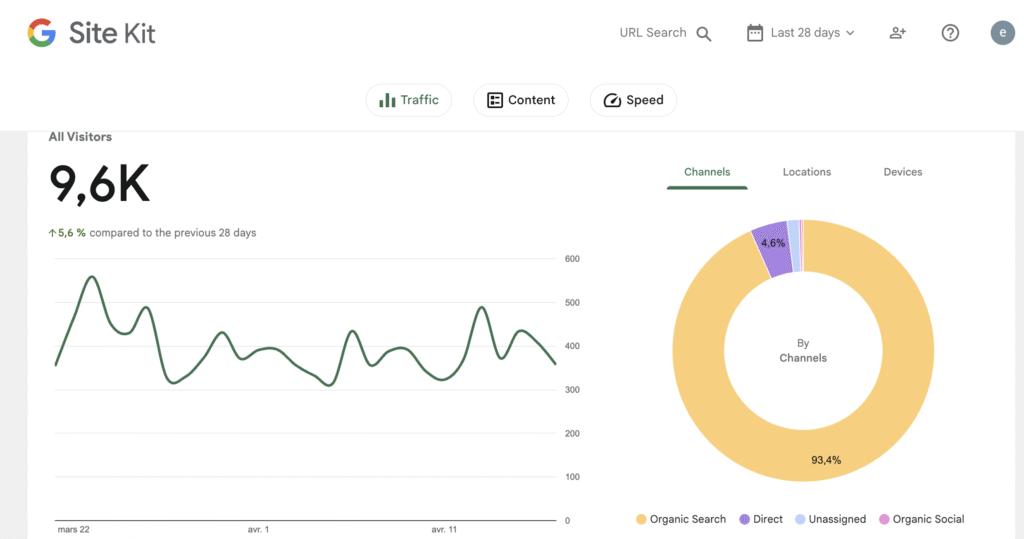 Voici une capture d’écran du nombre de visiteurs durant les 28 derniers jours (plugin Google Site Kit). Date = 22 avril 2025.